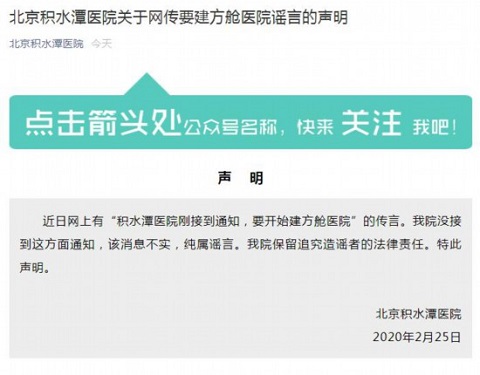 人民網(wǎng)北京2月25日電 據(jù)北京積水潭醫(yī)院官方微信公眾號(hào)消息,針對(duì)近日網(wǎng)上有“北京積水潭醫(yī)院剛接到通知,要開始建方艙醫(yī)院”的傳言,院方回應(yīng),沒接到這方面通知,該消息不實(shí),純屬謠言。