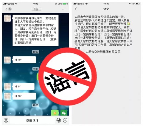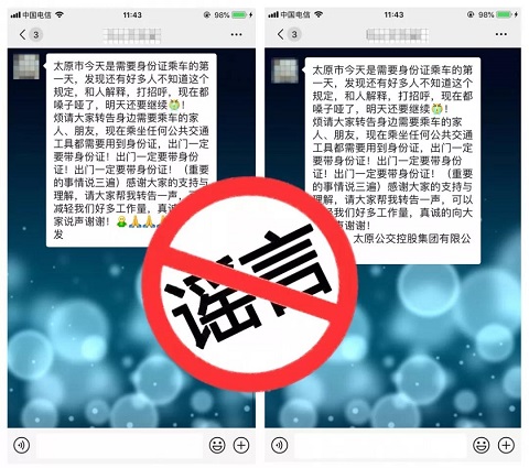 近日,微信朋友圈、釘釘、微博等社交平臺(tái)均在傳播“乘坐公交車需要出示身份證”的傳言。您收到了嗎?