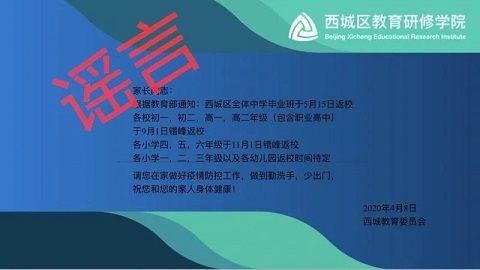 當(dāng)前 疫情防控牽動著全國人民的心 保障“戰(zhàn)疫” 我們在行動 中國互聯(lián)網(wǎng)聯(lián)合辟謠平臺 持續(xù) 粉碎謠言 為公眾還原真相 科學(xué)防控 抗擊疫情 一、俄將大規(guī)模驅(qū)逐中國公民?中國公民遭拘押? 日前,網(wǎng)上流傳消息稱,“俄羅斯政府將大規(guī)模驅(qū)逐中國公民”、“有中國公民因違反簽證、居留規(guī)定被俄方拘押”。 真相:4月7日,中國駐俄使館鄭重聲明,經(jīng)中俄兩國外交部門溝通核實,“俄將大規(guī)模驅(qū)逐中國公民”言論嚴(yán)重失實。中國駐俄使館和俄主管機關(guān)均未收到近期在莫斯科的中國公民遭受不公正待遇的申訴。 此外,俄羅斯外交部通報中國駐俄使館告,經(jīng)向俄內(nèi)務(wù)部等主管部門了解,近期在莫斯科并無中國公民因違反簽證、居留規(guī)定被俄方執(zhí)法部門拘押。此前,俄方曾表示,疫情期間涉及外國公民的所有簽證、居留問題都將本著特殊時期、特事特辦原則積極協(xié)調(diào)解決。 二、北京中小學(xué)畢業(yè)年級開學(xué)時間確定? 近日,“北京高三4月27日開學(xué),六年級和初三5月11日開學(xué)” 、“西城區(qū)全體中學(xué)畢業(yè)班5月15日返校”、“北京某區(qū)教委接到通知,確認(rèn)9月1日前不會復(fù)學(xué)”等一系列消息在網(wǎng)上流傳。