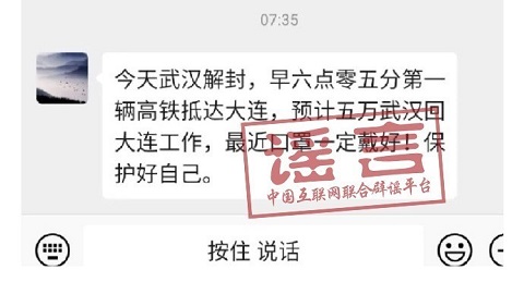 真相:4月7日-8日,北京市委教育工委、市教委及西城區(qū)委教育工委、區(qū)教委先后表示,相關(guān)消息都是虛假信息。目前,北京市委教育工委、市教委正在分批次、分類型做開學(xué)準(zhǔn)備工作,制定各批次、各年級開學(xué)詳細計劃。同時,從4月13日起,北京春季學(xué)期將實現(xiàn)“線上線下”無縫銜接,建立與疫情防控常態(tài)化相適應(yīng)的課程教學(xué)機制。近期,市委教育工委、市教委將公布具體開學(xué)時間,請大家以官方微信公號“首都教育”等權(quán)威發(fā)布為準(zhǔn)。 三、武漢解封,預(yù)計五萬武漢人回大連工作? 4月8日,有消息稱:“今天武漢解封,早六點零五分第一輛高鐵抵達大連,預(yù)計五萬武漢人回大連工作,最近口罩一定戴好……”。