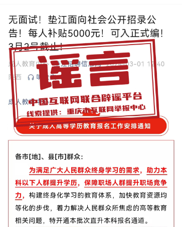 真相:近日,“墊江招聘信息網(wǎng)”微信公眾號發(fā)布信息:“無面試!重慶墊江面向社會公開招錄公告!每人補貼5000元!可入正式編!”部分網(wǎng)民看到該信息后誤認(rèn)為,墊江面向社會以補貼形式招錄具有正式編制的公務(wù)人員,于是紛紛向墊江縣有關(guān)部門致電咨詢招錄情況。經(jīng)核實,近年來,墊江未曾以補貼方式和不經(jīng)過面試招錄具有正式編制公務(wù)人員。該信息實則為成人學(xué)歷提升培訓(xùn)信息,而非正式編制公務(wù)人員招錄信息。墊江縣互聯(lián)網(wǎng)信息辦公室已依法對發(fā)布該信息的微信公眾號負(fù)責(zé)人進(jìn)行約談和教育批評,指出虛假信息的危害性,并責(zé)令刪除相關(guān)信息。(來源:重慶辟謠)
