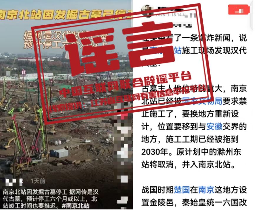 謠言:南京北站挖到古墓被停工了? 真相:近日,有網(wǎng)民在網(wǎng)絡(luò)平臺發(fā)帖稱,南京北站因挖到古墓,“已經(jīng)被國家文物局要求禁止施工了”“預(yù)計停工六個月或以上”“施工工期已經(jīng)被拖到2030年”等。經(jīng)江蘇省互聯(lián)網(wǎng)辟謠平臺與省文物部門和屬地核實,目前沒有收到國家文物局關(guān)于“南京北站禁止施工”的有關(guān)通知,南京北站除個別涉及考古發(fā)掘作業(yè)區(qū)域外,其他施工作業(yè)均按計劃正常有序推進(jìn),網(wǎng)傳信息系謠言。(來源:江蘇省互聯(lián)網(wǎng)辟謠平臺、“南京網(wǎng)絡(luò)辟謠”微信公眾號)