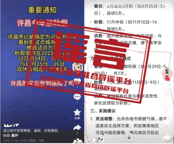 真相:近日,河南、安徽部分自媒體平臺(tái)發(fā)布關(guān)于中小學(xué)春秋放假的信息,聲稱(chēng)“許昌市已被確定為河南中小學(xué)春秋假試點(diǎn)城市之一”“周口市中小學(xué)2025年秋假時(shí)間安排如下”“蕪湖市中小學(xué)將在11月12日至14日放首個(gè)秋假,連周末共5天”,引發(fā)關(guān)注。對(duì)此,河南許昌、周口及安徽蕪湖教育部門(mén)作出回應(yīng):并無(wú)放秋假的安排,網(wǎng)傳消息均為謠言。中小學(xué)放假安排需嚴(yán)格遵循國(guó)家教育方針政策及當(dāng)?shù)亟逃块T(mén)的統(tǒng)一部署,結(jié)合本地教育教學(xué)實(shí)際統(tǒng)籌規(guī)劃。如需了解相關(guān)安排,請(qǐng)通過(guò)屬地教育部門(mén)官方網(wǎng)站,切勿輕信、傳播未經(jīng)官方確認(rèn)的“小道消息”。(來(lái)源:“清朗河南”微信公眾號(hào)、@大河網(wǎng)、安徽網(wǎng)絡(luò)辟謠平臺(tái))