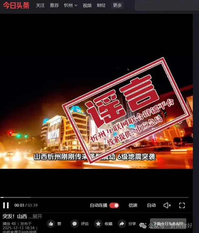 2025年12月13日,有網(wǎng)民發(fā)布“突發(fā)!山西忻州遭遇6級地震,多地震感強(qiáng)烈”等不實(shí)信息,引發(fā)網(wǎng)民關(guān)注。
