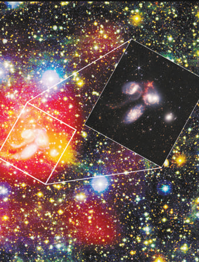 經(jīng)過(guò)研究分析,科研團(tuán)隊(duì)最終選中了著名致密星系群“斯蒂芬五重星系”進(jìn)行觀測(cè)。自1877年被法國(guó)天文學(xué)家斯蒂芬發(fā)現(xiàn)后,“斯蒂芬五重星系”便是天文學(xué)領(lǐng)域最受關(guān)注的星系群,也成為韋布空間望遠(yuǎn)鏡第一批觀測(cè)并首次向公眾展示的5個(gè)目標(biāo)之一。