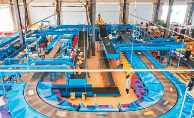 在湖南省永州市藍(lán)山縣創(chuàng)品國(guó)際智慧物流園,智能分揀系統(tǒng)對(duì)快件包裹進(jìn)行有序分揀。彭 華攝(人民圖片)