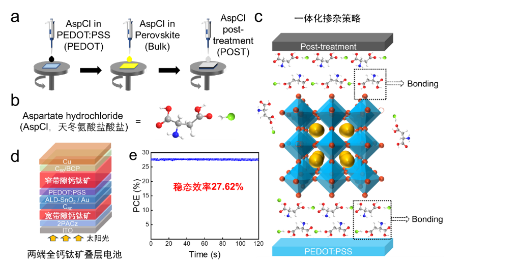 為此,研究團隊將天冬氨酸鹽酸鹽引入到全鈣鈦礦疊層太陽能電池底部的空穴傳輸層、鈣鈦礦體吸光層和上界面層中,開發(fā)了一種采用同一分子處理的一體化摻雜策略,極大地改善了鈣鈦礦薄膜的質(zhì)量。除了與鈣鈦礦前驅(qū)體配位外,天冬氨酸鹽酸鹽分子還具有很強的分子間氫鍵,富集在鈣鈦礦上、下界面處的天冬氨酸鹽酸鹽因此充當(dāng)了鈣鈦礦層和傳輸層界面之間的分子鎖,進(jìn)一步提升了鈣鈦礦材料的性能和穩(wěn)定性。