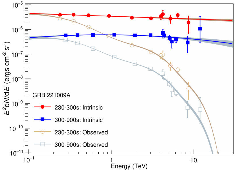 “拉索”測量的GRB 221009A在230-300秒和300-900秒兩段時間的伽馬射線能譜。(中國科學(xué)院高能物理研究所供圖)