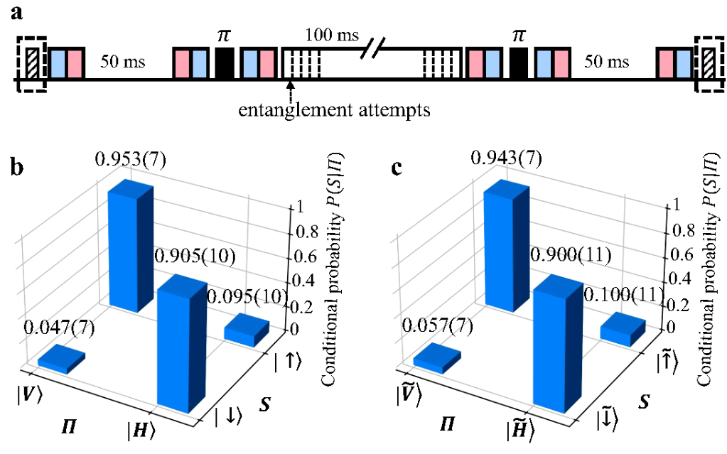 實(shí)驗(yàn)發(fā)現(xiàn),通過此方法制備出的通訊比特,可在數(shù)百毫秒的時(shí)間內(nèi)生成離子-光子糾纏;通過自旋回波方法可延長存儲(chǔ)比特的存儲(chǔ)壽命,實(shí)現(xiàn)相干時(shí)間達(dá)到秒量級(jí)的存儲(chǔ)量子比特。通過比較有無離子-光子糾纏生成操作時(shí)存儲(chǔ)比特的保真度變化,研究人員證實(shí)了兩種量子比特之間低于實(shí)驗(yàn)精度的串?dāng)_誤差,從而實(shí)現(xiàn)了無串?dāng)_的量子網(wǎng)絡(luò)節(jié)點(diǎn)。