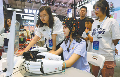 觀眾在北京舉辦的世界機(jī)器人博覽會(huì)上體驗(yàn)人工智能多模態(tài)腦機(jī)接口平臺(tái)。陳曉根攝(人民視覺(jué))