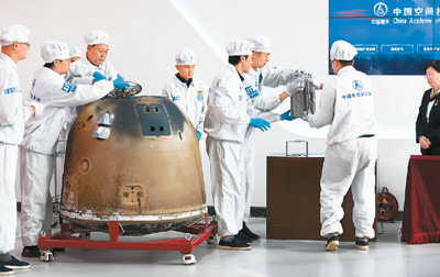 在中國(guó)航天科技集團(tuán)五院舉行的嫦娥六號(hào)返回器開艙儀式現(xiàn)場(chǎng),科研人員取出月球樣品容器準(zhǔn)備稱重。新華社記者 金立旺攝