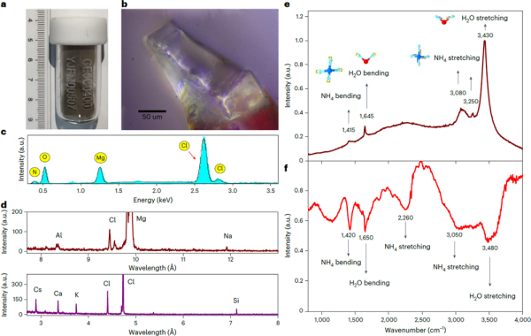 團隊研究發(fā)現(xiàn),ULM-1的分子式中含有多達6個結(jié)晶水,水分子在樣品中的質(zhì)量比高達41%。從晶體的紅外光譜和拉曼光譜上,均可以清晰觀察到源于水分子和銨的特征振動峰。