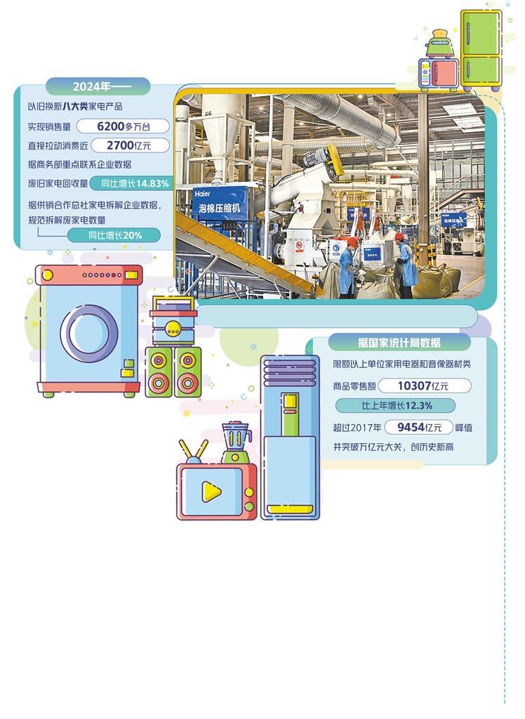 自《推動(dòng)大規(guī)模設(shè)備更新和消費(fèi)品以舊換新行動(dòng)方案》(以下簡(jiǎn)稱《行動(dòng)方案》)實(shí)施以來,家電市場(chǎng)消費(fèi)潛力得到顯著釋放。數(shù)據(jù)顯示,2024年,中央加力支持以舊換新八大類家電產(chǎn)品實(shí)現(xiàn)銷售量6200多萬臺(tái),直接拉動(dòng)消費(fèi)近2700億元。日前,國(guó)家發(fā)展改革委副主任趙辰昕在國(guó)務(wù)院政策例行吹風(fēng)會(huì)上介紹,2025年將延續(xù)并加力擴(kuò)圍實(shí)施“兩新”政策,享受以舊換新補(bǔ)貼的家電產(chǎn)品種類由2024年的8類增至12類,單件最高補(bǔ)貼可達(dá)銷售價(jià)格的20%。