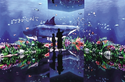 圖為游客在位于濟(jì)南市的山東省美術(shù)館參觀體驗(yàn)“無(wú)限之?!背两紸I數(shù)字藝術(shù)展。新華社發(fā)(郝鑫城 攝)