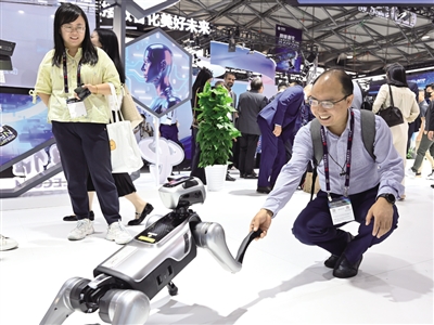 6月18日,觀眾在2025年世界移動(dòng)通信大會(huì)(上海)中國(guó)電信展臺(tái)與智能機(jī)器狗互動(dòng)。 記者 陳愛(ài)平 攝