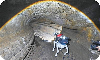 圖為柔性臂機(jī)器人在鏡泊湖火山地下熔巖管道現(xiàn)場(chǎng)工作。張春祥攝(人民視覺)