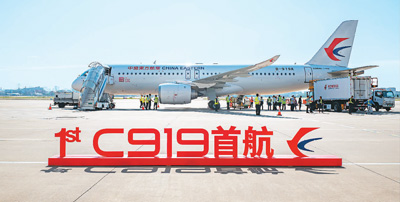 5月28日,國(guó)產(chǎn)大飛機(jī)C919迎來(lái)商業(yè)航班首飛。王 初攝(人民圖片)
