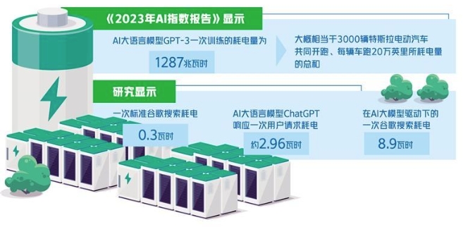 人工智能大模型到底有多耗能?據(jù)斯坦福人工智能研究所發(fā)布的《2023年AI指數(shù)報告》,AI大語言模型GPT-3一次訓(xùn)練的耗電量為1287兆瓦時,大概相當(dāng)于3000輛特斯拉電動汽車共同開跑、每輛車跑20萬英里所耗電量的總和。報告同時提出,AI大語言模型GPT-3一次訓(xùn)練,相當(dāng)于排放了552噸二氧化碳。