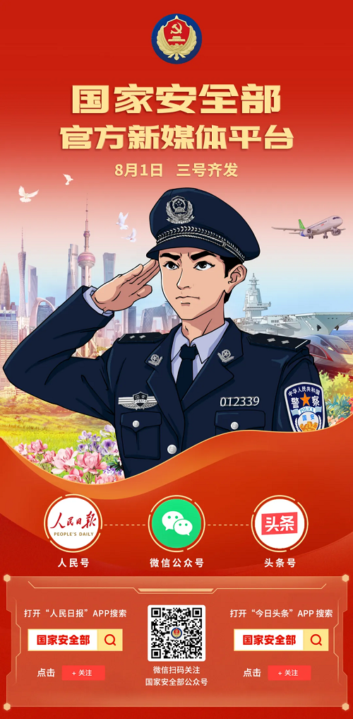 今天,國(guó)家安全部頭條號(hào)、人民號(hào)正式上線了。這是國(guó)家安全機(jī)關(guān)新的官方權(quán)威宣傳陣地,與國(guó)家安全部官微共同打造國(guó)家安全部官方新媒體平臺(tái)。歡迎大家關(guān)注國(guó)家安全部官方微信公眾號(hào)、國(guó)家安全部頭條號(hào)、國(guó)家安全部人民號(hào),感受隱蔽戰(zhàn)線的“神秘”工作、“神奇”事業(yè)、神圣使命!