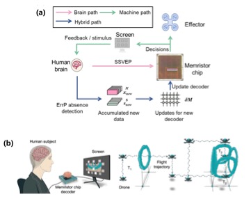 (a)腦-憶阻器交互式更新框架;(b)基于憶阻器腦電解碼的實時腦控?zé)o人機(jī)飛行。(聯(lián)合研究團(tuán)隊供圖)