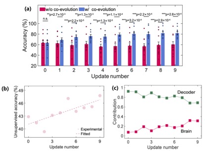 (a)協(xié)同演進(jìn)腦機(jī)解碼正確率較初始狀態(tài)提高20%;(b)任務(wù)相關(guān)腦電特征發(fā)生正向演化;(c)腦與憶阻器解碼器實現(xiàn)互適應(yīng)。(聯(lián)合研究團(tuán)隊供圖)