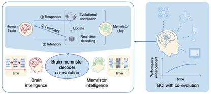天津大學(xué)與清華大學(xué)的聯(lián)合研究團(tuán)隊針對這一難題,發(fā)現(xiàn)腦電信號的非平穩(wěn)特性與任務(wù)腦電演變密切相關(guān)。基于此,他們創(chuàng)新性地提出了“雙環(huán)路腦機(jī)協(xié)同演進(jìn)框架”,并通過憶阻器神經(jīng)形態(tài)器件加以實現(xiàn)。在“雙環(huán)路”框架下,腦與機(jī)的學(xué)習(xí)環(huán)路相互協(xié)同,共同促進(jìn)系統(tǒng)性能的提升。