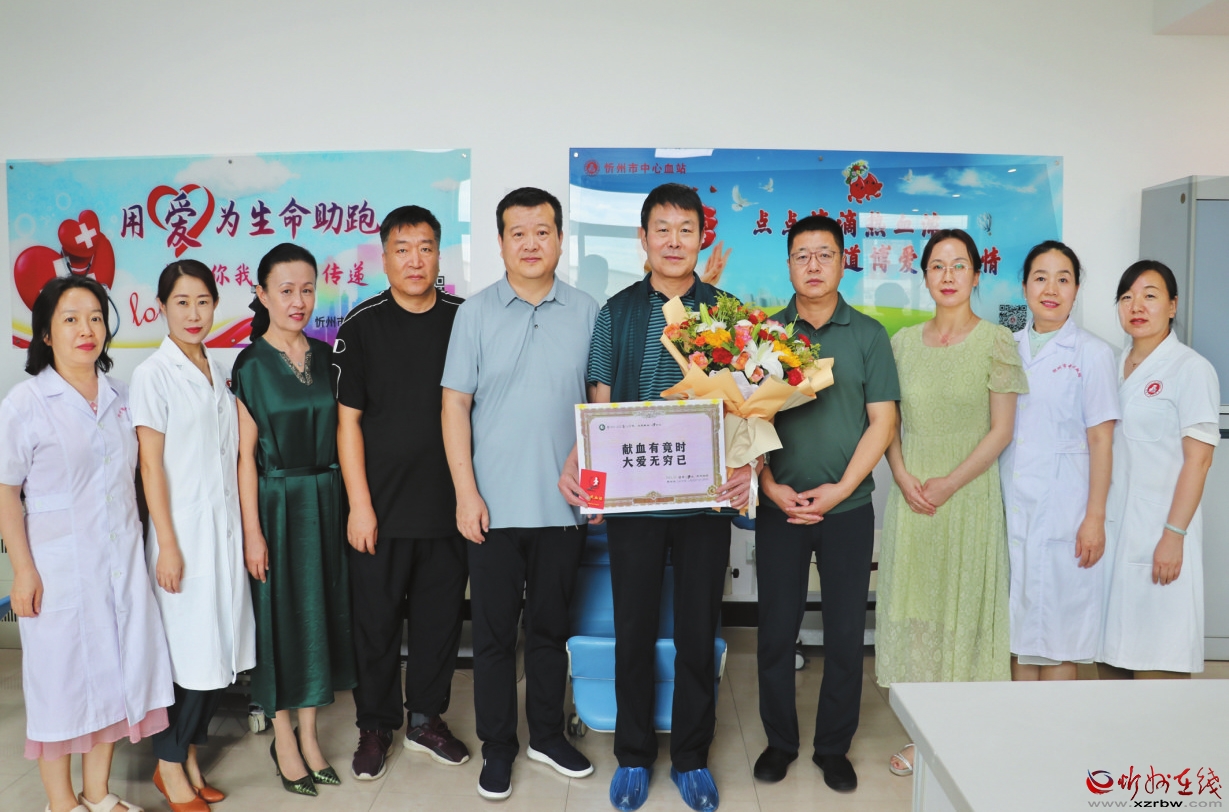 梁占海先生是我市繁峙籍人士,原計劃在7月18日,60周歲生日當天完成最后一次獻血。連日暑浪滾滾,7月13日下午他瞅準雨后氣溫下降的空隙,駕車125公里來到市中心血站,捐獻2治療量的血小板,在六十周歲生日,完成最后一獻“光榮退役”。血站郭建卿站長率班子成員到現(xiàn)場慰問,對他發(fā)揚人道主義精神,弘揚助人為樂品德的行動表示贊揚,對他為我市無償獻血事業(yè)做出的貢獻表示感謝。獻血結束后,中心血站的領導護士同梁占海先生合影留念,祝賀他花甲生日吉祥、身體健康。