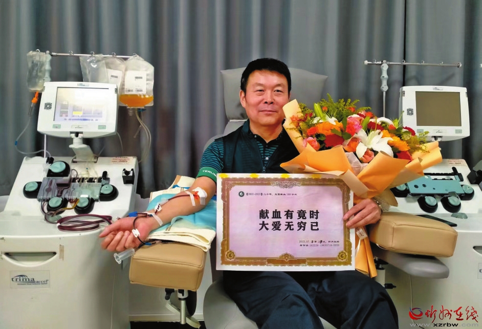 獻血有量,大愛無疆。梁占海表示,獻血雖然結束了,但自己將從此轉(zhuǎn)向無償獻血志愿服務隊伍,終身服務于無償獻血這一公益事業(yè)。(本報記者 王金華)