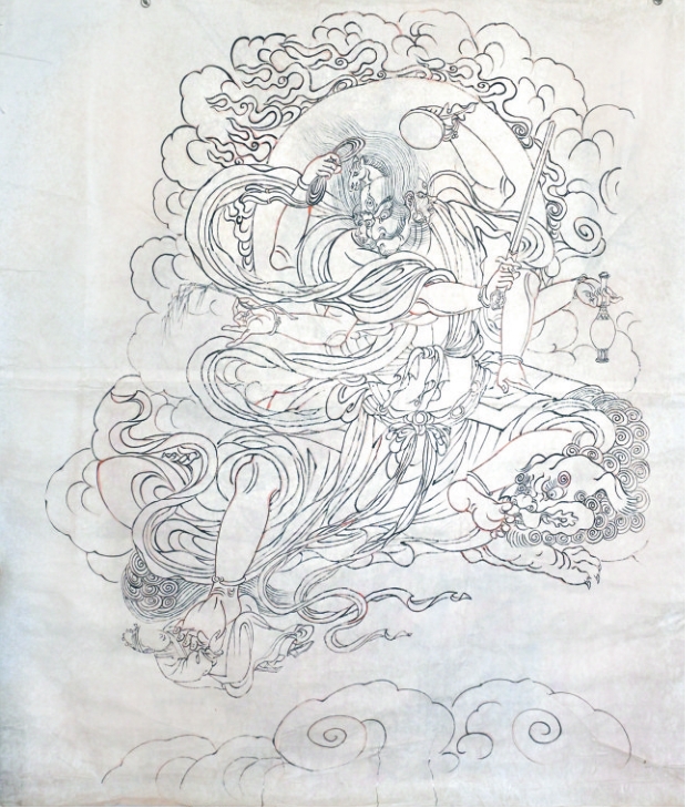 在李向東看來,臨寫是為了學(xué)習(xí)而不是“復(fù)制”壁畫。面對(duì)殘破或年久漫漶不清的畫面,他從蛛絲馬跡入手反復(fù)揣摩,根據(jù)壁畫整體的線描、造型特點(diǎn),一一補(bǔ)而畫之,最后定稿。從這個(gè)意義上說,李向東也使殘破的公主寺壁畫得以復(fù)原,“補(bǔ)壁”之功不可小覷。