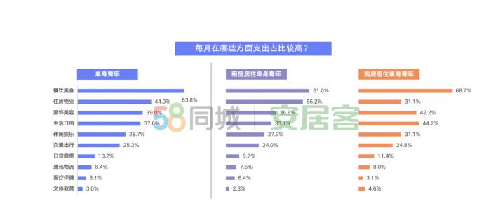 圖片來(lái)源:《2020年單身青年居行報(bào)告》 在為何買(mǎi)房這件事上,單身青年也有自己的想法。有62.5%的單身青年表示是為了追求穩(wěn)定居所,25.9%的單身青年購(gòu)房是為了房產(chǎn)的保值/升值空間,超一成的單身青年購(gòu)房主要是為了增加脫單的幾率。在這一點(diǎn)上,單身男青年選擇購(gòu)房增加脫單幾率的占比高于女性。 6成單身青年吃比住花得多,7成宅家多數(shù)時(shí)間玩手機(jī) 大多數(shù)人看來(lái),單身人群的生活似乎單調(diào)無(wú)趣,但從調(diào)研花費(fèi)情況來(lái)看,單身人群的生活實(shí)則豐富多彩。 吃,是一大生活樂(lè)趣來(lái)源。報(bào)告顯示,63.8%的單身青年表示每月在餐飲美食上的花銷(xiāo)占比較高。此外,住房物業(yè)、服飾美容、生活日用等方面也是單身青年的主要開(kāi)銷(xiāo)。
