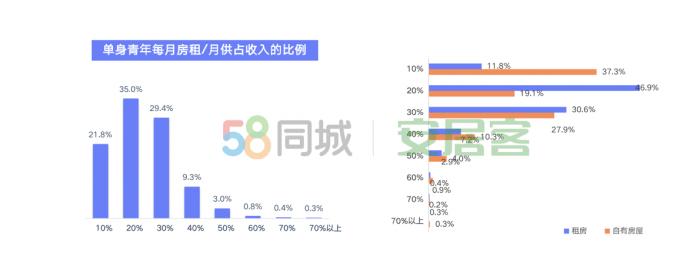 圖片來(lái)源:《2020年單身青年居行報(bào)告》 同時(shí),還有50.1%的單身青年目前租房居住,居住成本是一筆不小的支出項(xiàng),約65%的單身青年每月在房租/月供的開(kāi)銷(xiāo)占收入的20-30%。