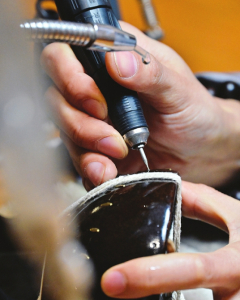 蘆圣杰用金剛鉆在瓷器破損處打眼。