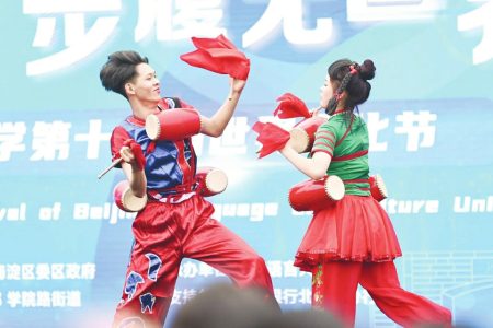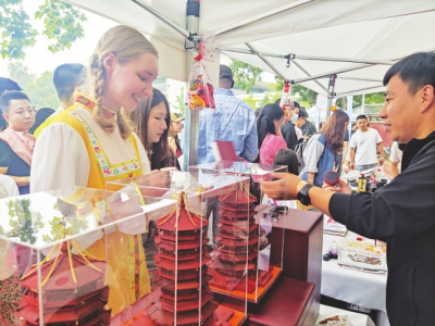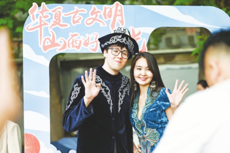 當(dāng)日活動吸引了來自世界各地的3萬余名師生及社會各界人士。獨唱《人說山西好風(fēng)光》《千年一塔》,舞蹈《醋之韻》《翼城花鼓》等贏得師生們熱烈掌聲。在五大洲文化展區(qū),絳州木版年畫傳承人吳百鎖現(xiàn)場印制木版年畫贈送師生,成為一道亮麗風(fēng)景。廣靈剪紙、應(yīng)縣木塔模型、黎侯虎、寧武毛健茶等吸引各國留學(xué)生駐足欣賞?!叭A夏古文明山西好風(fēng)光”主題相框前,無數(shù)外國友人饒有興趣交流互動,拍照留念。“山西元素”火爆北京語言大學(xué)世界文化節(jié)。