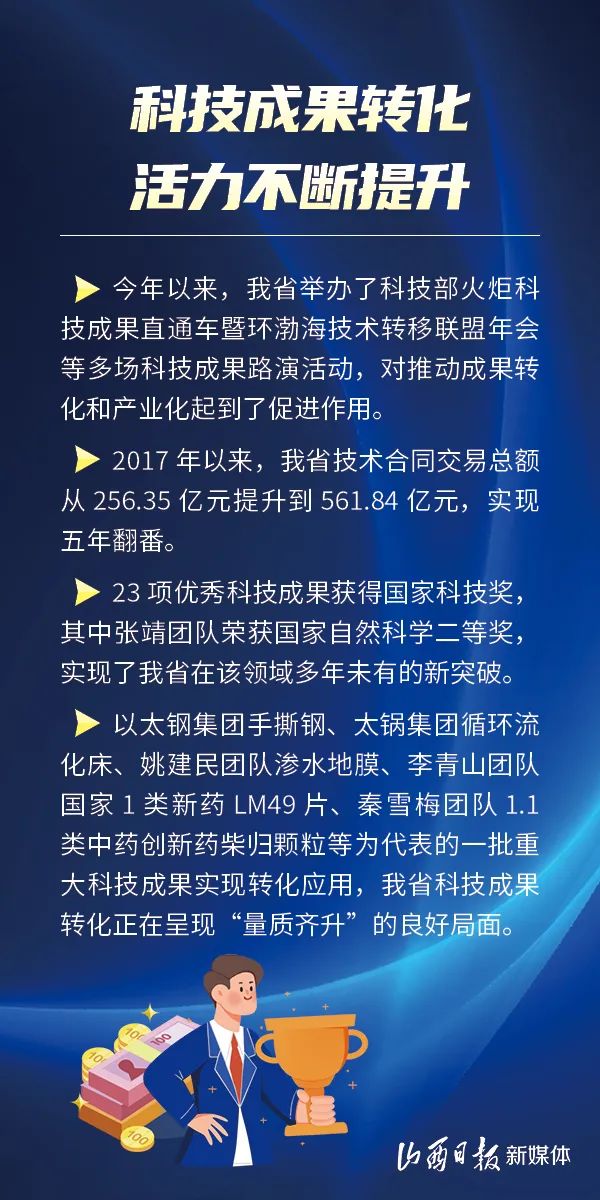 制定出臺激勵科技成果轉(zhuǎn)化法規(guī)政策24個、技術(shù)合同交易總額實現(xiàn)五年翻番、科技成果轉(zhuǎn)化引導專項五年累計投入2.21億元……近年來,我省科技成果轉(zhuǎn)化堅持新發(fā)展理念,加速科技成果在晉落地轉(zhuǎn)化和產(chǎn)業(yè)化,取得顯著成效。