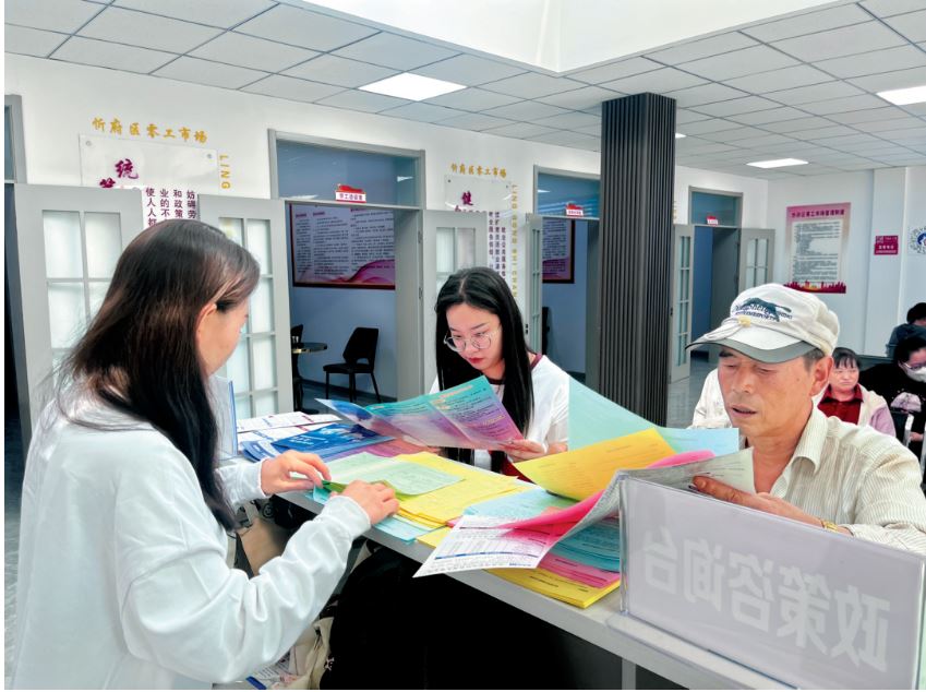 在零工市場服務大廳內,休息座椅、飲水機、急救藥箱一應俱全,還提供免費茶水、免費WiFi、免費借閱圖書、工具租賃等便民服務。前來登記的求職者絡繹不絕,工作人員與志愿者指導他們填寫《求職人員登記表》,并重點填寫是否參加過職業(yè)技能培訓、是否有參加技能培訓的意愿,以便為供需雙方搭建平臺。