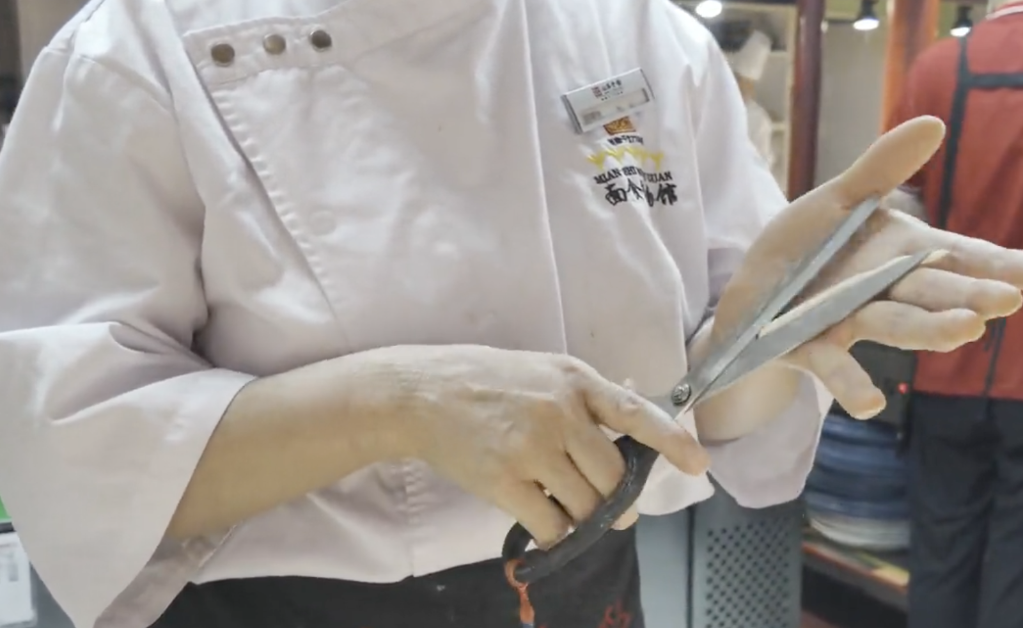 圖為夾心面。新華社記者 王怡靜 攝??關(guān)于剪刀面的故事很動人——“‘剪子面,兩頭尖,吃到肚里胃不酸’。相傳剪刀面是以前喬家大院的喬貴發(fā)走西口的時候,留在家里的妻子為丈夫裁剪衣服,由于過于思念丈夫,一走神就把剪刀也帶到了廚房里,于是便有了剪子面?!覆凰帷?,其實也是‘心不酸’。”李琨說。剪刀面一般用來做湯面,配蔬菜吃,也有著希望家人安康的寄托。