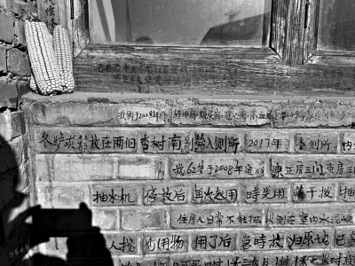 2024年春天,78歲的張福青過世了。那時,環(huán)游中國的攝影師蔡山海,路過代縣上高陵村,恰巧碰上從外地趕回老家的張宏剛、張宏英為剛過世的父親舉行葬禮。他被葬禮上的鑼鼓聲吸引,走進院子時,卻被寫滿院子的文字震撼到。隨后,蔡山海用相機拍下那些寫在紅磚墻、木門窗上的文字,并發(fā)在“小紅書”上,隨即走紅網(wǎng)絡(luò)。