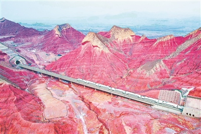 圖為1月18日,一列動(dòng)車(chē)組列車(chē)行駛在蘭州市境內(nèi)的丹霞地貌群中。