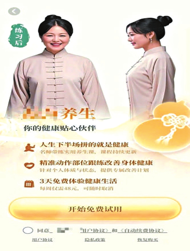 還有些App則更加離譜,下載完成后,點進(jìn)去的第一步就是要購買會員,之后才能正常使用。但在購買流程上,平臺卻耍起了花招。比如一款提供“養(yǎng)生指導(dǎo)服務(wù)”的App,頁面上會有一個大大的按鈕,寫著“開始免費試用”。但在按鈕的旁邊,卻有一行非常不起眼的小字:“每周僅需48元,可隨時取消?!倍坏┯脩酎c擊開始試用,系統(tǒng)就會跳轉(zhuǎn)到自動續(xù)費的開通界面。如果是辨別能力差的老人,可能還以為是在填寫什么注冊信息。
