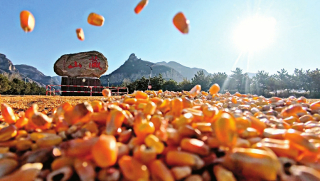 從空中俯瞰,景區(qū)標(biāo)志性的刻有“藏山”字樣的巨石,被連片的玉米“花?!杯h(huán)繞,綿延千米的道路上,玉米粒被村民們精心鋪成整齊的波紋狀,宛如一條流淌的金色長(zhǎng)河?!敖衲昃皡^(qū)把這么寬的路讓給我們晾曬糧食,真的解決了我們一大難題!”正在翻曬玉米的村民李師傅說道。
