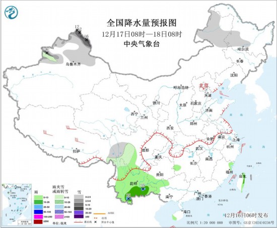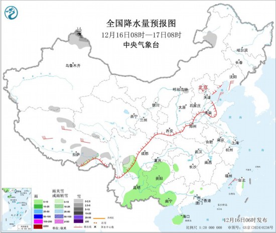 全國降水量預(yù)報(bào)圖(12月16日08時(shí)-17日08時(shí))