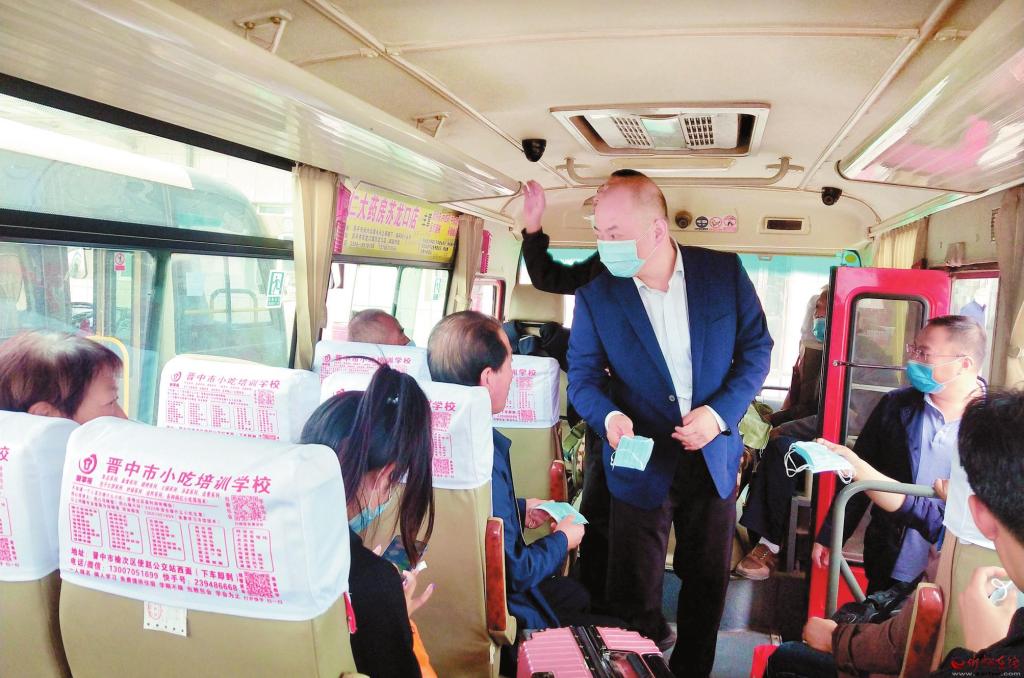 原平市交通運輸局加強對交通運輸企業(yè)、“兩客一危一貨”、旅游包車、網(wǎng)絡包車和重點路段的監(jiān)督檢查,嚴厲打擊“三超一疲勞”、非法載客、超員超限、疲勞駕駛和違規(guī)冒險行車等違法違規(guī)行為。在抓安全的同時,將疫情防控常態(tài)化,強調汽車站工作人員必須做好登記工作,督促乘客佩戴口罩。圖為工作人員在客車上為旅客發(fā)放口罩。( 劉建春 攝)