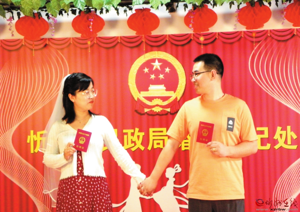 在頒證儀式上,登記員帶領(lǐng)新人宣讀結(jié)婚誓言。忻州市婦聯(lián)、市民政局相關(guān)領(lǐng)導(dǎo)為新人送上溫馨祝福。在忻府區(qū)民政局婚姻登記服務(wù)中心,新人們臉上洋溢著幸福的笑容,來(lái)到婚姻登記窗口依次辦理結(jié)婚手續(xù)。