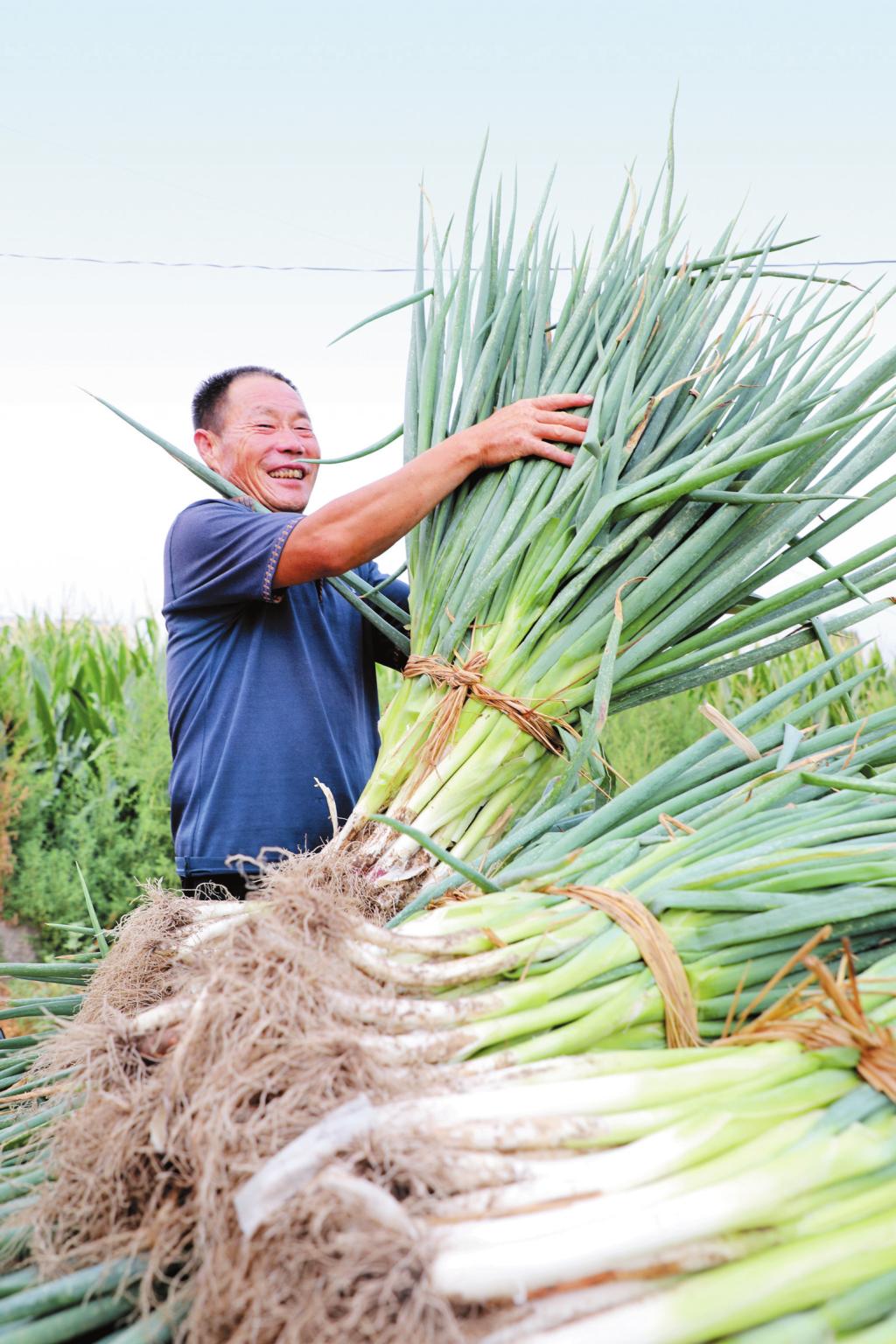 8月13日,原平市新原街道解放街村農(nóng)民正在收獲大蔥。近年來(lái),該市積極引導(dǎo)農(nóng)民結(jié)合市場(chǎng)需求調(diào)整種植結(jié)構(gòu),大力發(fā)展大蔥種植,為當(dāng)?shù)剞r(nóng)民開(kāi)辟增收致富新途徑,助力鄉(xiāng)村振興。 (郝子星 攝)