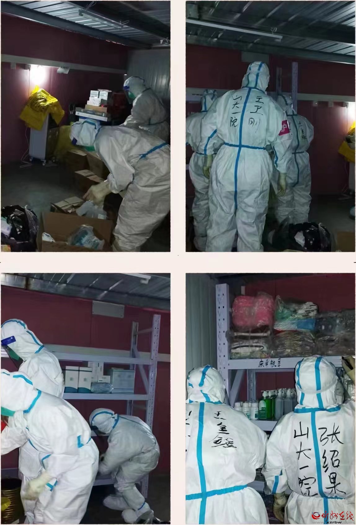 工作人員都在井然有序地工作,防護(hù)服上寫有名字。