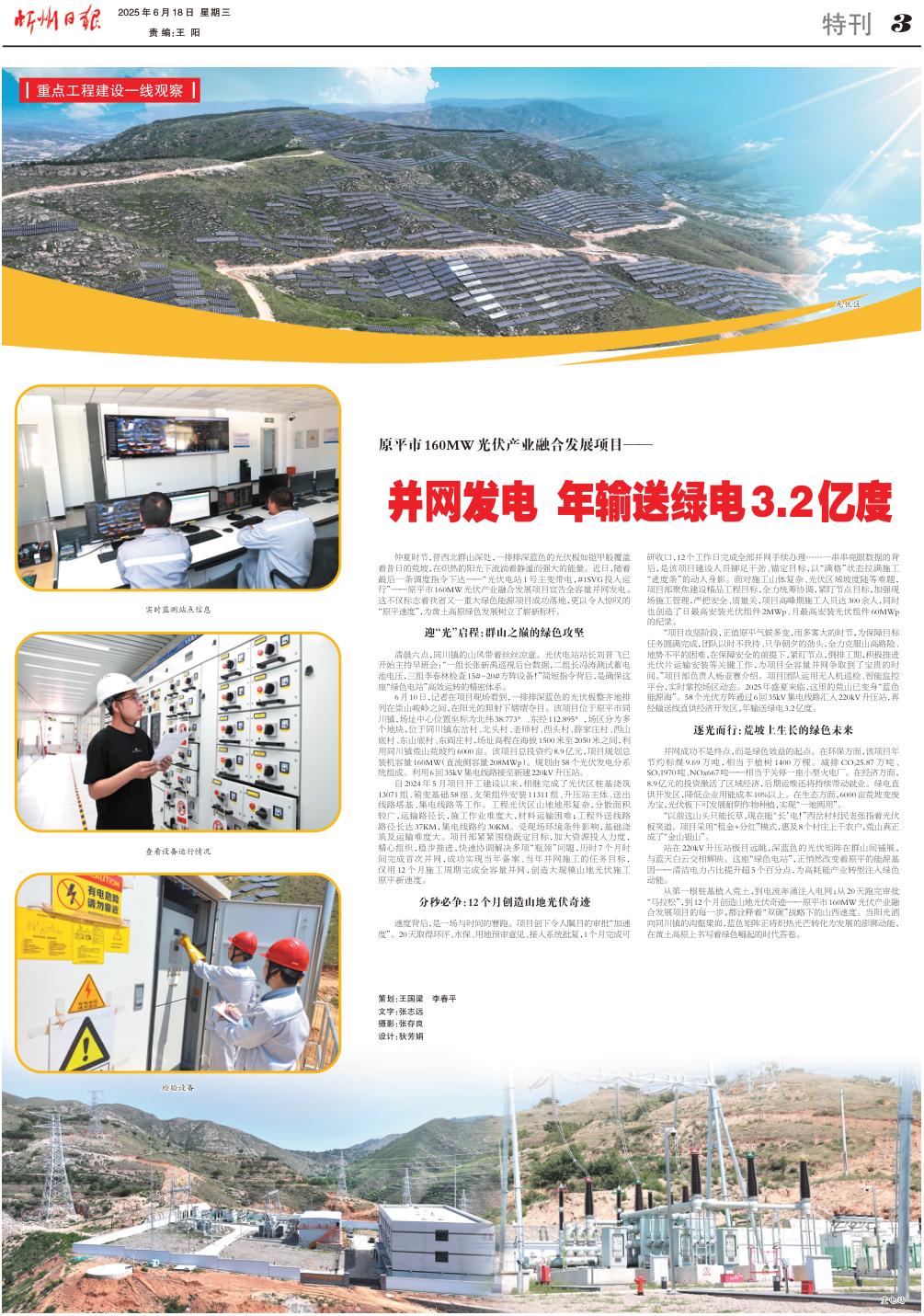 仲夏時節(jié),晉西北群山深處,一排排深藍(lán)色的光伏板如鎧甲般覆蓋著昔日的荒坡,在熾熱的陽光下流淌著靜謐而強(qiáng)大的能量。近日,隨著最后一條調(diào)度指令下達(dá)——“光伏電站1號主變帶電,#1SVG投入運(yùn)行”——原平市160MW光伏產(chǎn)業(yè)融合發(fā)展項目宣告全容量并網(wǎng)發(fā)電。這不僅標(biāo)志著我省又一重大綠色能源項目成功落地,更以令人驚嘆的“原平速度”,為黃土高原綠色發(fā)展樹立了嶄新標(biāo)桿。