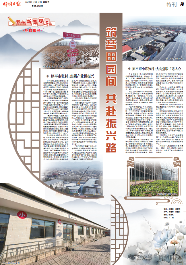 張村地處城鄉(xiāng)接合部,區(qū)位優(yōu)越,東鄰滹沱河,南接原平高速路出口,西鄰大運(yùn)高速,北靠國家電投集團(tuán)山西鋁業(yè)有限公司。全村耕地2400畝,全部為水澆地。近年來,村集體通過多種渠道發(fā)展壯大集體經(jīng)濟(jì),2023年集體經(jīng)濟(jì)收入20萬余元。除了蓮藕種植項(xiàng)目外,村黨支部牽頭成立智聚民心農(nóng)業(yè)開發(fā)服務(wù)有限公司,購置拖拉機(jī)、打捆機(jī)等農(nóng)機(jī),通過服務(wù)托管的方式,為本村和周邊群眾提供社會(huì)化服務(wù)?!敖衲晖瓿汕锔?000余畝,為村集體增收10萬余元;盤活閑置門面房出租,年增收4.5萬元;出租集體機(jī)動(dòng)地,增收5萬元;光伏發(fā)電年增收5000余元?!惫瓭欐i,這位老支書飽含感情且語氣堅(jiān)定地對(duì)記者說,“我們要讓每寸土地都發(fā)揮最大效益,讓村民共享發(fā)展成果。”