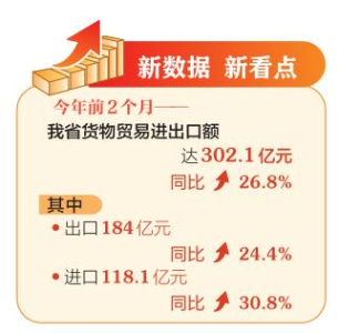 在去年同期低基數(shù)、重點(diǎn)企業(yè)延續(xù)增長(zhǎng)態(tài)勢(shì)、多個(gè)重點(diǎn)商品大幅增長(zhǎng)的疊加影響下,今年前2個(gè)月全省外貿(mào)實(shí)現(xiàn)大幅增長(zhǎng),新增長(zhǎng)點(diǎn)不斷涌現(xiàn)。出口商品中,手機(jī)及零件、軌道交通裝備和煤炭是拉動(dòng)出口增長(zhǎng)的主要因素;進(jìn)口商品中,集成電路、各類(lèi)金屬礦砂、煤炭是拉動(dòng)進(jìn)口增長(zhǎng)的主要因素。