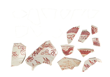 明代細(xì)白瓷礬紅彩龍紋殘片(部分)。本欄圖片均據(jù)新華社