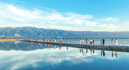 6月9日,運城市七彩鹽湖景區(qū)游人如織,藍(lán)天、白云、遠(yuǎn)山、鹽湖構(gòu)成一幅美麗畫卷,游客們宛如穿梭在“天空之鏡”。金玉敏攝